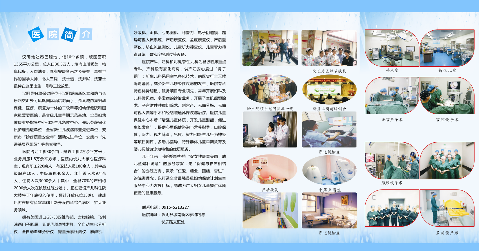 擁有美國(guó)進(jìn)口GE-E8四維彩超、宮腹腔鏡、飛利浦西門(mén)子彩超、鉬靶乳腺X射線(xiàn)機(jī)、全自動(dòng)生化分析儀、全自動(dòng)血球分析儀、微量元素檢測(cè)儀、麻醉機(jī)、呼吸機(jī)、dr機(jī)、心電圖機(jī)、利普刀、電子陰道鏡、超導(dǎo)可視人流系統(tǒng)、產(chǎn)后康復(fù)儀、盆底康復(fù)儀,產(chǎn)后熏蒸儀,臍血流監(jiān)測(cè)儀、兒童聽(tīng)力篩查儀、兒童智力篩查系統(tǒng)、骨密度檢測(cè)儀等設(shè)備。
